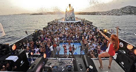 Os recogeremos en los hoteles e iremos hacia el puerto, donde embarcaremos y zarparemos con la mejor música a bordo a cargo de uno de nuestros DJ’s.